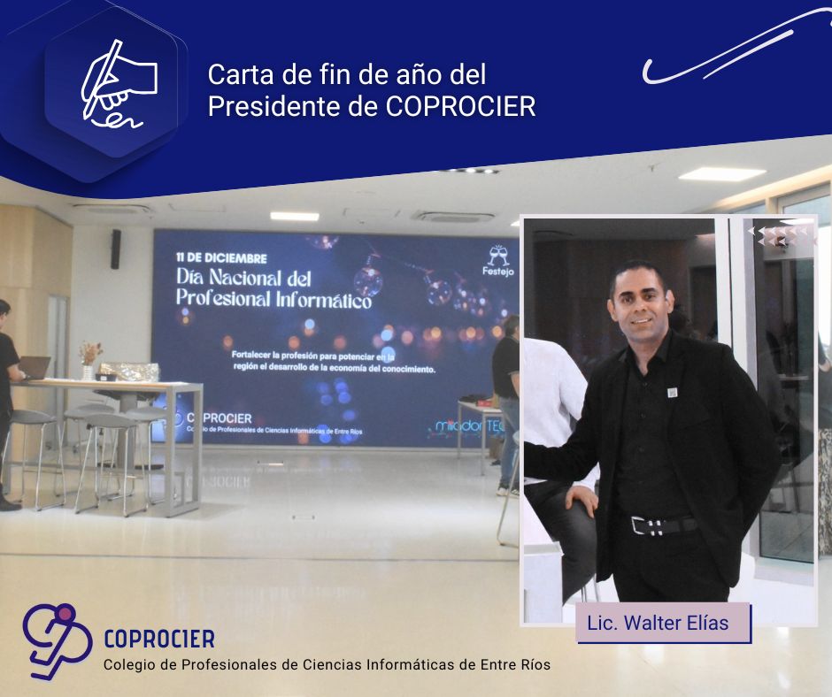 Con motivo de la proximidad de las fiestas de Fin de Año, y en el marco de las celebraciones por el Día del Profesional Informático que festejamos este 11 de diciembre, el Presidente de COPROCIER, Lic. Walter Elías, comparte unas palabras a todos los matriculados. Además, incluimos aquí una galería de fotos de la Fiesta del Profesional Informático realizada en el edificio de MiradorTec.