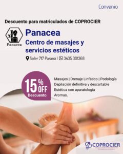 COPROCIER firmó un convenio con Panacea -Salón de bienestar- por el cual los matriculados del Colegio y sus familiares directos obtendrán un descuento del 15% sobre la tarifa neta de mostrador en los servicios que ofrece este centro de masajes y servicios estéticos.