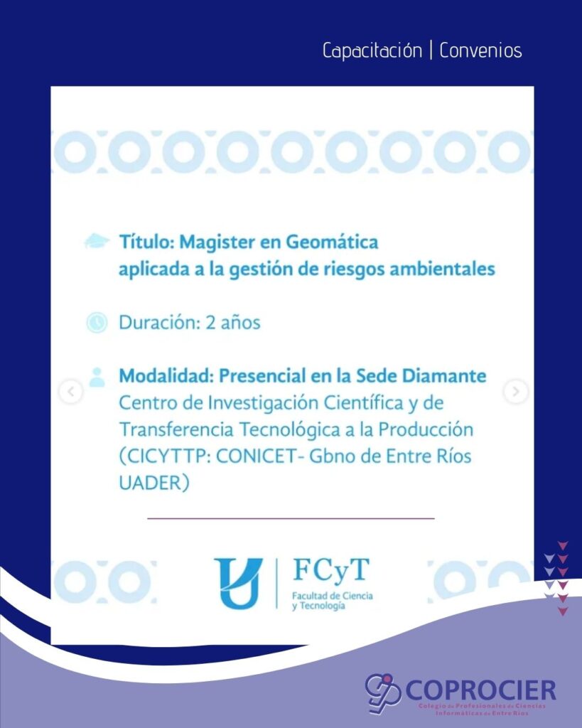 Las personas interesadas en obtener información adicional sobre la carrera podrán consultar la web https://fcyt.uader.edu.ar/carreras/maestria-profesional-en-geomatica-aplicada-a-la-gestion-de-riesgos-ambientales/ o a través del sitio específico de la carrera: www.maestriageomatica.org.