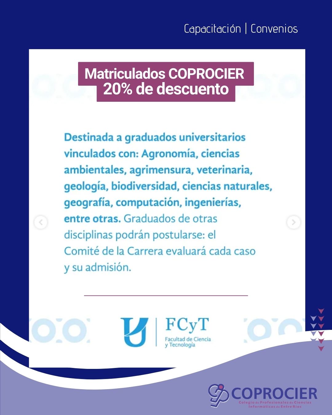 Atención matriculados COPROCIER. Por gestiones realizadas por nuestro Colegio, los/las profesionales matriculados/as en COPROCIER podrán acceder a esta carrera de posgrado con descuento de 20% en los aranceles.